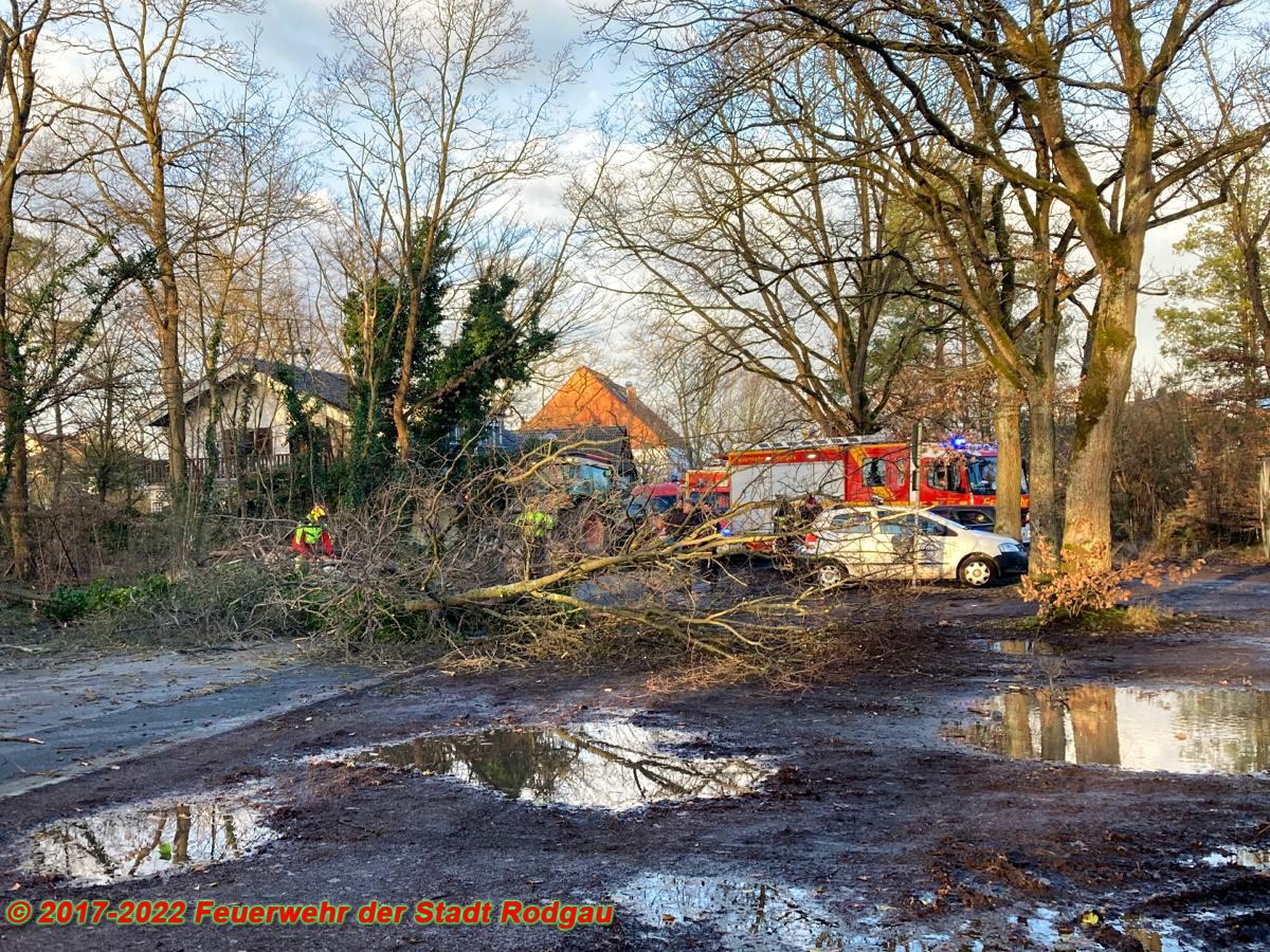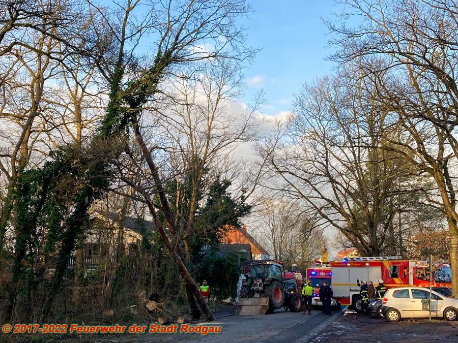 Vier Bäume drohten nach dem vergangenen Sturm auf die Straße zu stürzen. Vor der kontrollierten Entfernung der Bäume, wurden mit Hilfe eines Abschleppwagens gefährdete PKW aus dem Fallbereich versetzt und die Einsatzstelle abgesichert.