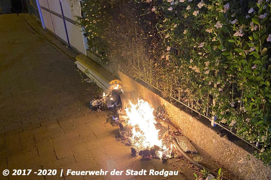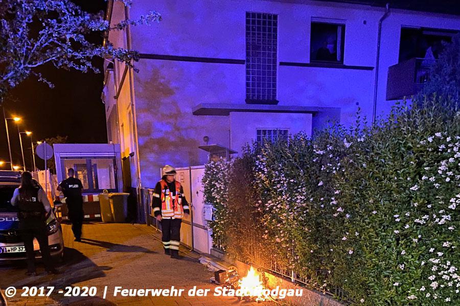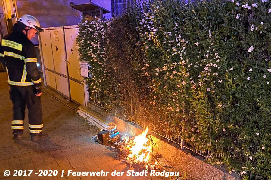 Die Feuerwehr wurde zu einem Feuer auf dem Gehweg alarmiert. Es brannte Unrat und ein Gebüsch, dabei wurde auch ein Starkstromkabel eines Baustromkasten zerstört. Die Einsatzkräfte löschten das Feuer und schalteten den Strom ab.