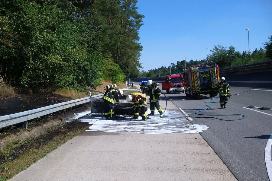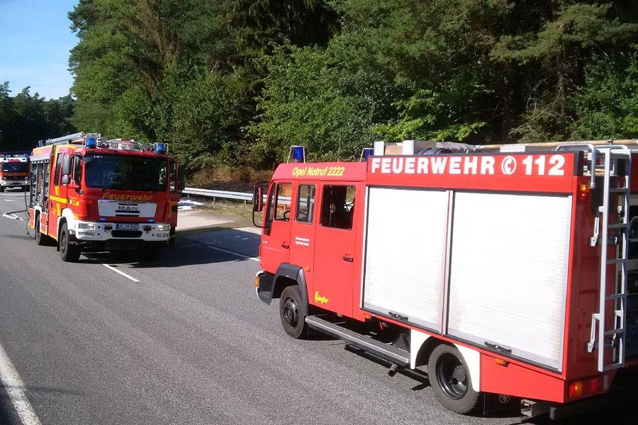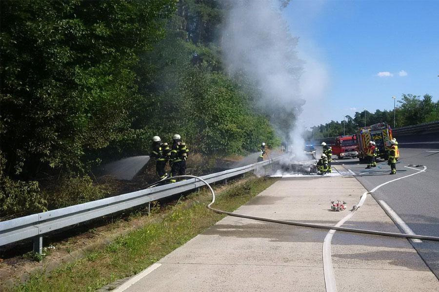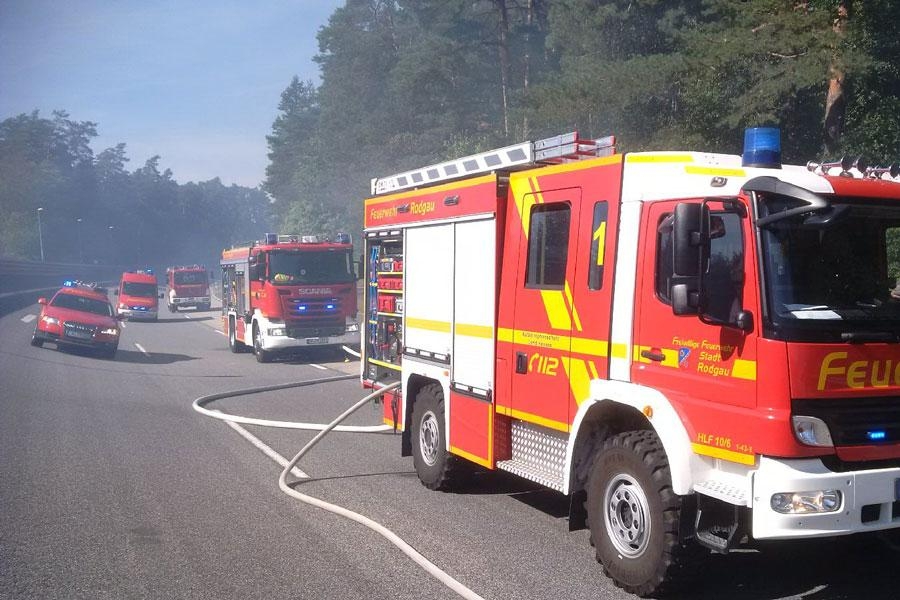 Die Feuerwehr Rodgau wurde zu einem ausgedehnten Fahrzeugbrand alarmiert. Das Feuer griff auch auf den angrenzenden Wald über, insgesamt brannten ca. 200 qm Waldboden. Zur Sicherheit wurde auch die Feuerwehr Babenhausen alarmiert.