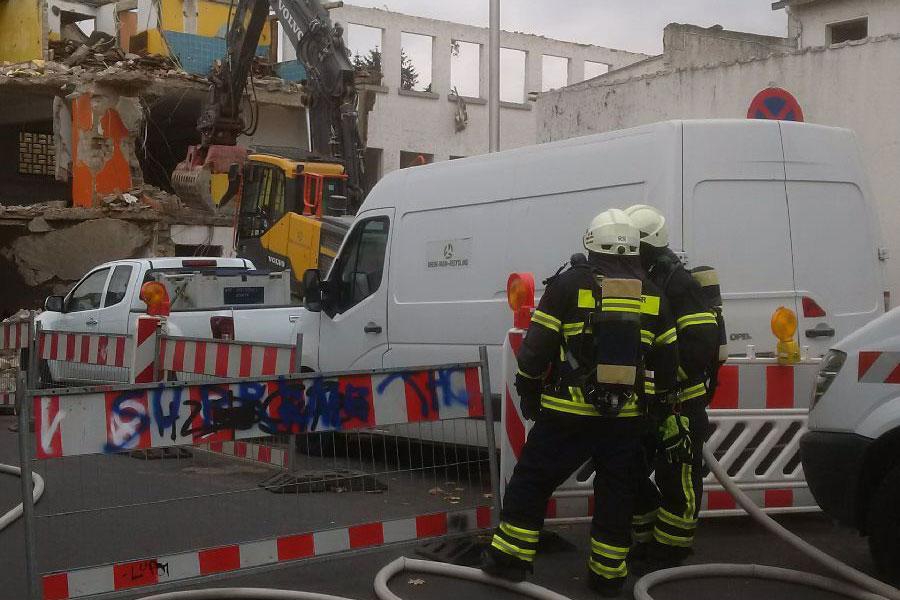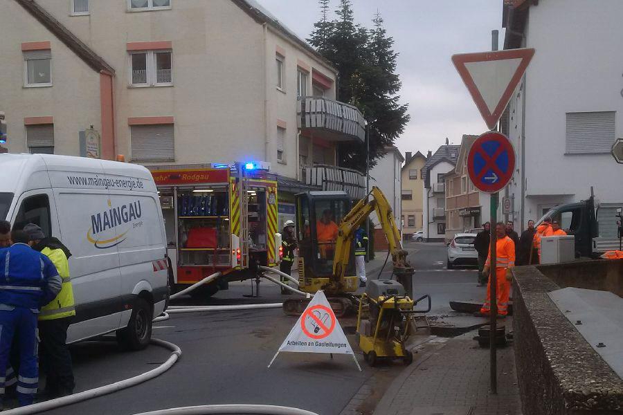 Bei Abrissarbeiten wurde eine Gashauptleitung zerstört. Die Feuerwehr sperrte weiträumig ab, evakuierte die Anwohner, stellet den Brandschutz sicher und führte Messungen durch. Durch den Gasversorger und einer Fachfirma wurde die Gaszufuhr durch umfangreiche Eingriffsmaßnahmen im Straßenbereich dicht gesetzt. Die evakuierten Anwohner wurden im Betreuungsbus des Kreises untergebracht. Die Feuerwehr Rodgau wurde durch weitere Kräfte aus Rödermark, Neu-Isenburg und Hainburg unterstützt, weiterhin kamen Fachberater für den Bereich Chemie, der stellv. Kreisbrandinspektor, sowei massive Polizeikräfte und Rettungsdienstkräfte hinzu.